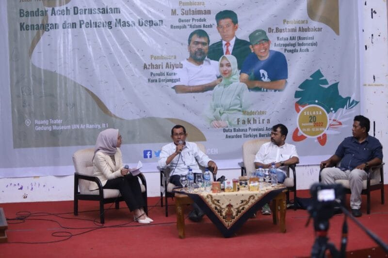 Dalam Talkshow tersebut menghadirkan Ketua Asosiasi Antropologi Indonesia (AAI) Aceh Dr Bustami Abubakar, Azhari Aiyub penulis Kura-Kura Berjanggut dan M Sulaiman owner produk rempah Aslam Aceh sebagai narasumber yang dipandu oleh Fakhira selaku Duta Bahasa Provinsi Aceh Tahun 2022. []