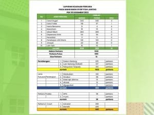 Mahkamah Syar’iyah Jantho menutup tahun 2022, Dengan progres penyelesaian perkara sebagaimana direkam pada laman sistem informasi perkara sejumlah ( 1021 ) perkara atau 98,84 %, dengan sisa perkara hanya 12 perkara atau 1,16 %, terdapat penambahan persentase perkara dari tahun 2021 yaitu 798 perkara dan pada tahun 2022 sejumlah 1022, bertambah yaitu 224 perkara atau meningkat 28 persen, dan disisi lain perkara yang terdaftar secara elektronik ( E – Court ) sebanyak 696 perkara, atau dengan kata lain dari 100 % perkara yang didaftarkan oleh Para Pihak, 68,10 % menggunakan fasililitas secara elektronik ( E – Court ).