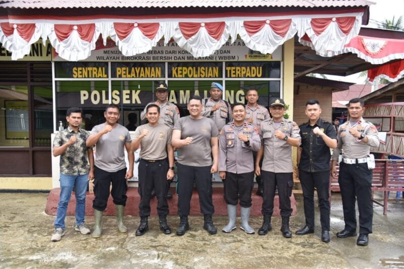Selanjutnya, Mike Hardy yang didampingi Wakapolres, pejabat utama, dan personil melaksanakan gotong royong membersihkan Polsek terdampak banjir.[]