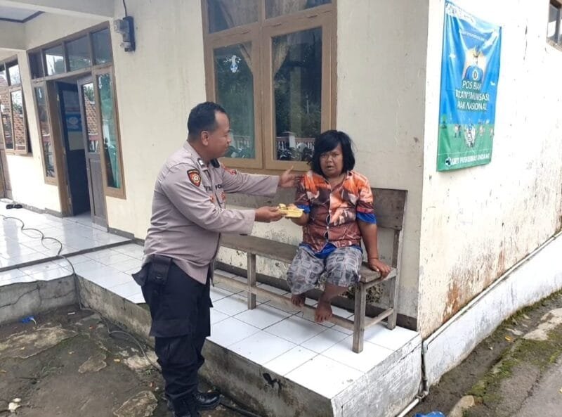 Hal itu ditunjukkan Kanit Samapta Polsek Sukahaji Polres Majalengka Polda Jabar Aiptu Riyana membagikan makanan kepada warga kurang mampu. Rabu (25/1/2023).