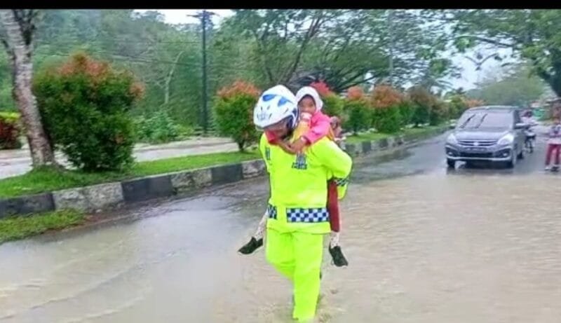 KSINews, Sinabang – Kasat Lantas Polres Simeulue Iptu Irvan Effendi Pasaribu menggendong anak sekolah dasar (SD) yang ingin menyeberang jalan di lokasi yang tergenang air pascabanjir.