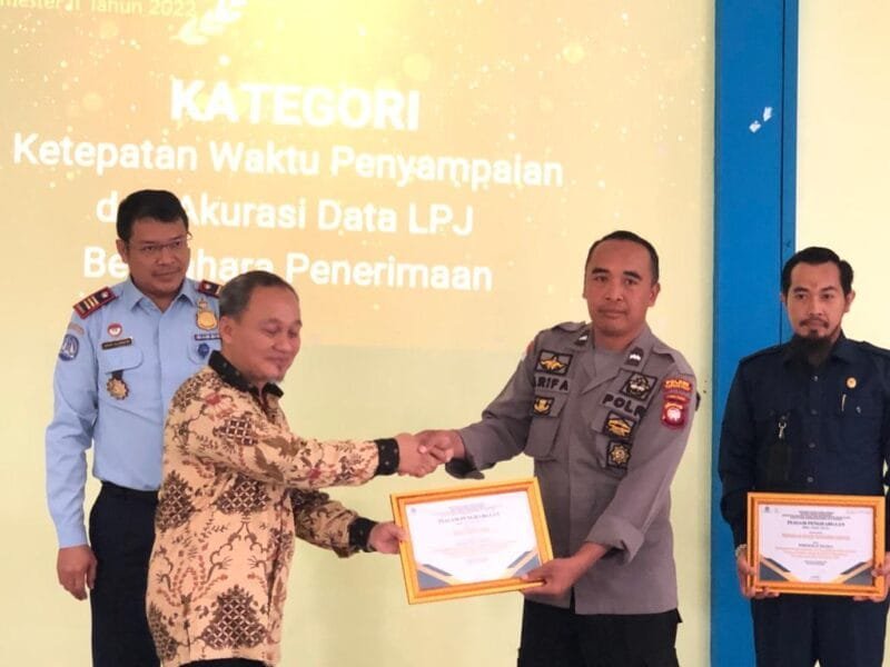 Penyerahan penghargaan diberikan langsung oleh Kepala KPPN Putussibau Sri Winarno ke Kapolres Kapuas Hulu AKBP France Yohanes Siregar, S.I.K., yang diwakili oleh Wakapolres Kompol Hilman Malaini, S.H., S.I.K., M.H., yang didampingi Kasi Keu Aipda Arif Ariyanto, di Aula Kantor KPPN Putussibau, Selasa (28/2/23).
