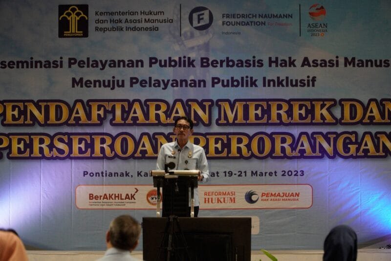 Untuk itu Kemenkumham menggandeng Friedrich Naumann Stiftung (FNS), menggelar Diseminasi Pelayanan Publik Berbasis HAM Menuju Pelayanan Publik Inklusif bagi Pendaftaran Merek dan Perseroan Perorangan di Pontianak, Senin (20/03/23).