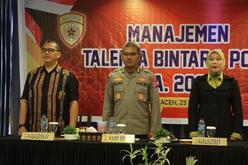 KSINews, Banda Aceh – Kepala Biro Sumber Daya Manusia (Karo SDM) Polda Aceh Kombes Fajar Budiyanto menyebut, bahwa penguatan pembangunan SDM dilakukan melalui manajemen talenta. Strategi ini diharapkan dapat mengidentiifikasi talenta-talenta yang berdaya saing unggul, yang nantinya akan dipersiapkan untuk jadi figur agen perubahan atau _agent of change_, berjiwa visioner, memotivasi, mampu mengembangkan diri juga orang lain, serta berpengaruh baik terhadap lingkungan di sekitarnya.