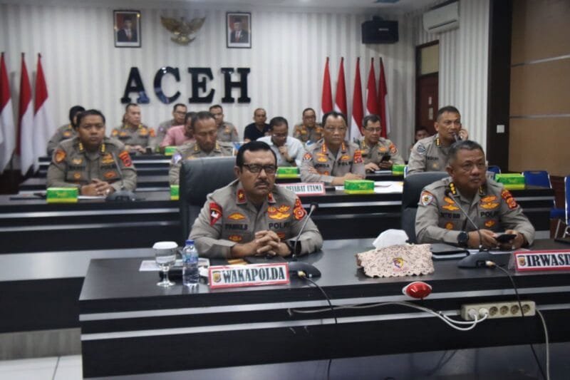 Banda Aceh – Wakapolda Aceh Brigjen Syamsul Bahri menghadiri rapat yang dipimpin Wakapolri Komjen Gatot Eddy Pramono secara virtual di ruang vidcon Mapolda Aceh, Selasa, 13 Juni 2023.
