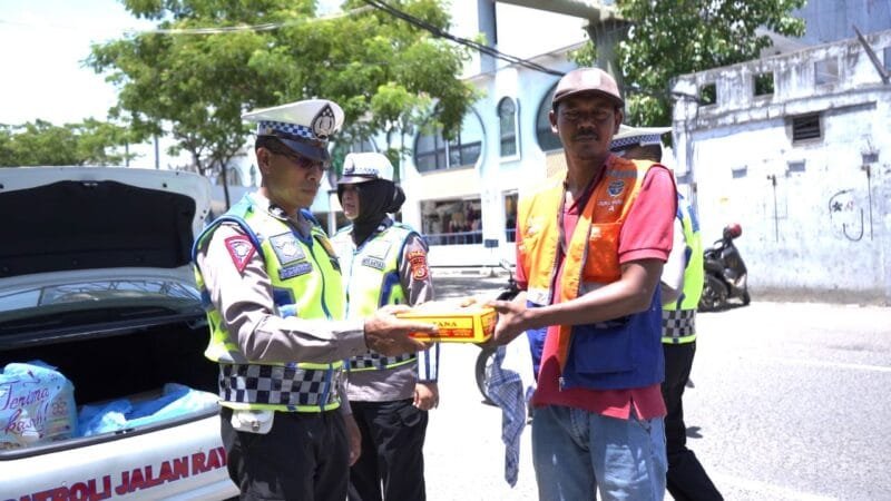 KSINews, Banda Aceh — Personel Subdit Kamsel Ditlantas Polda Aceh membagikan nasi kotak kepada tukang parkir, pengemis, dan tunawisma di Pasar Aceh, Kota Banda Aceh, Jumat, 4 Agustus 2023.