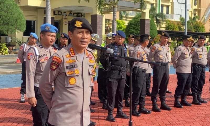 KSINews, Banda Aceh — Satgas Operasi Mantap Brata Seulawah 2023-2024 menggelar apel siaga di lapangan Polda Aceh, Selasa, 7 November 2023. Apel siaga tersebut dipimpin Kasatgas Operasi Mantap Brata Seulawah Kombes Misbahul Munauwar.