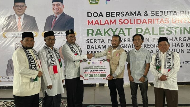 Pada kesempatan itu Kepala Kantor Kementerian Agama Kabupaten Aceh Besar Saifuddin juga menyerahkan langsung donasi untuk rakyat Palestina melalui lembaga kemanusiaan MER-C sebesar Rp 30 juta. Kata Saifuddin , pada November 2023 lalu Kemenag Aceh Besar juga sudah menyerahkan donasi sebesar Rp 105 juta melalui Kanwil Kemenag Aceh.