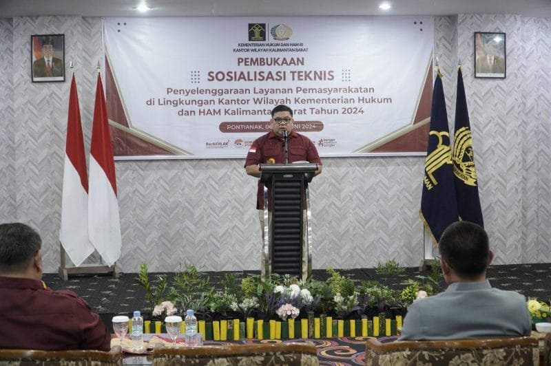 Pontianak, – Kepala Kantor Wilayah Kementerian Hukum dan HAM Kalimantan Barat, Muhammad Tito Andrianto, secara resmi membuka Kegiatan Sosialisasi Teknis Penyelenggaraan Layanan Pemasyarakatan Bidang Pembinaan dan Keamanan Tahun 2024 pada Kamis (6/6) siang. Acara ini digelar di Meranti Meeting Room, Hotel Borneo Pontianak.