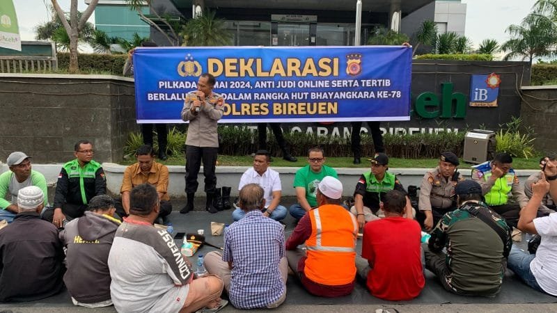Kegiatan ini dipimpin langsung oleh AKBP Jatmiko, SH.MH Mengucapkan Selamat datang kepada bapak-bapak yang hadir pada pagi hari ini, kami ucapkan terima kasih atas kehadirannya dalam kegiatan yang kita laksanakan hari ini, yaitu deklarasi pilkada damai, anti judi online, serta tertib lalu lintas dalam rangka HUT Bhayangkara ke-78 tahun 2024. Mari kita bersama-sama mendukung terciptanya lingkungan yang aman, damai, dan tertib.