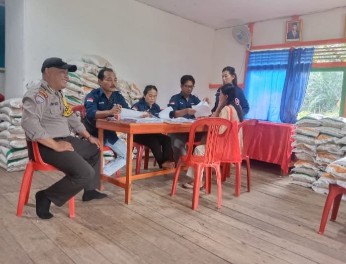 Air Besar, – Bhabinkamtibmas Polsek Air Besar Polres Landak Polda Kalbar AIPDA Dwi Oktariza melaksanakan pengamanan dan pendampingan penyaluran penerima bantuan pangan dalam program bantuan pangan tahun 2024 berupa beras dari Badan Pangan Nasional Atau Bulog (Badan Urusan Logistik) di Kantor Desa Sepangah Kecamatan Air Besar Kabupaten Landak, Kamis (4/7/24).