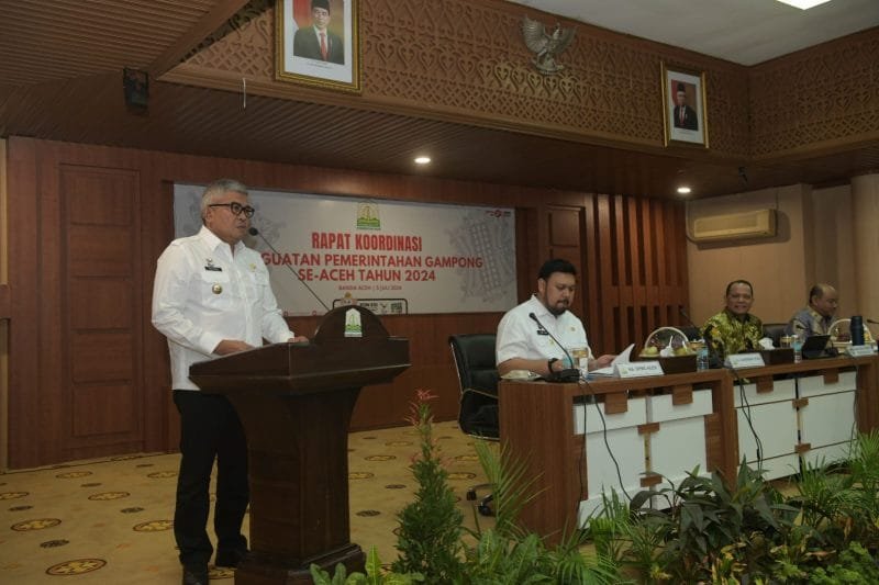 BANDA ACEH – Penjabat (Pj) Gubernur Aceh Bustami membuka Rapat Koordinasi (Rakor) Penguatan Pemerintah Gampong Seluruh Aceh di Gedung Serbaguna Setda Aceh, Jum’at, (05/07/2024). Rakor itu dihadiri Direktur Jenderal Bina Pemerintah Desa Kementerian Dalam Negeri, Dr. La Ode Ahmad P. Bolombo, Kepala Kantor Wilayah Ditjen Perbendaharaan Provinsi Aceh, para kepala SKPA terkait serta peserta rakor dari kabupaten kota.