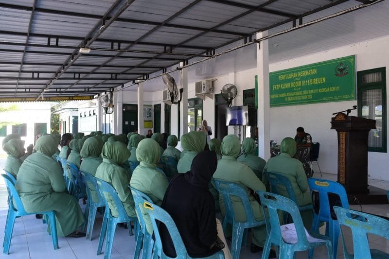 Bireuen, – Persit Kartika Chandra Kirana Cabang XXXIV Dim 0111 Koorcab Rem 011 PD Iskandar Muda melaksanakan kegiatan penyuluhan Kesehatan oleh FKTP Klinik Kodim 0111/Bireuen bertempat di Tribun Makodim 0111/Bireuen. Senin (15/07/2024).