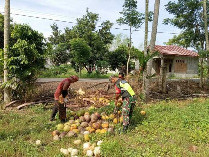 Bireuen, – Babinsa Pos Ramil Peusangan Selatan Kodim 0111/Bireuen melaksanakan kegiatan anjang sana di desa binaan dalam membantu mengupas kelapa tua milik warga untuk di jadikan kopra, serta menghimbau kepada warga desa agar selalu menjaga keamanan dan ketertiban bertempat di Desa Geulanggang Labu Kecamatan Peusangan Selatan Kabupaten Bireuen. Senin (15/07/2024).