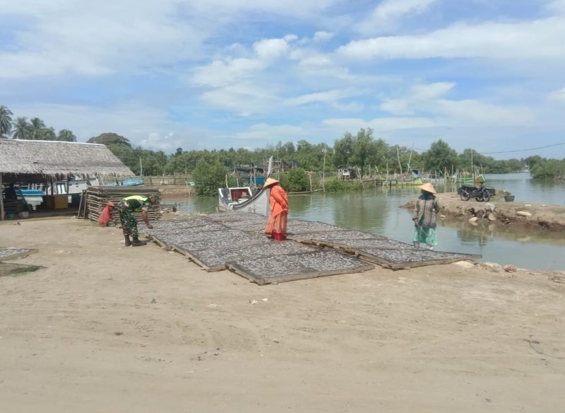 Bireuen, – Babinsa Koramil 03/Jeunieb Kodim 0111/Bireuen Sertu Fadli melaksanakan Komsos (Komunikasi Sosial) dan membantu masyarakat menjemur ikan teri di pesisir pantai Desa Lancang Kecamatan Jeunieb Kabupaten Bireuen. Selasa (23/07/2024).