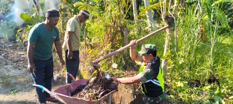 Gotong royong melibatkan warga masyarakat setempat.“Hal ini menjadi perhatian penting karena musim hujan telah tiba, dan saluran air yang tersumbat oleh rumput dan sampah dapat menjadi pemicu potensi banjir” Ujar Babinsa.