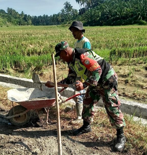 Bireuen, – Koptu Munawarah Babinsa Koramil 08/Gandapura Kodim 0111/Bireuen membantu warga Bapak Mawardi mengaduk semen untuk pembuatan saluran air di sawah di desa binaan bertempat di Desa Paloh Kayee Kunyet Kecamatan Gandapura Kabupaten Bireuen. Kamis (31/10/24).