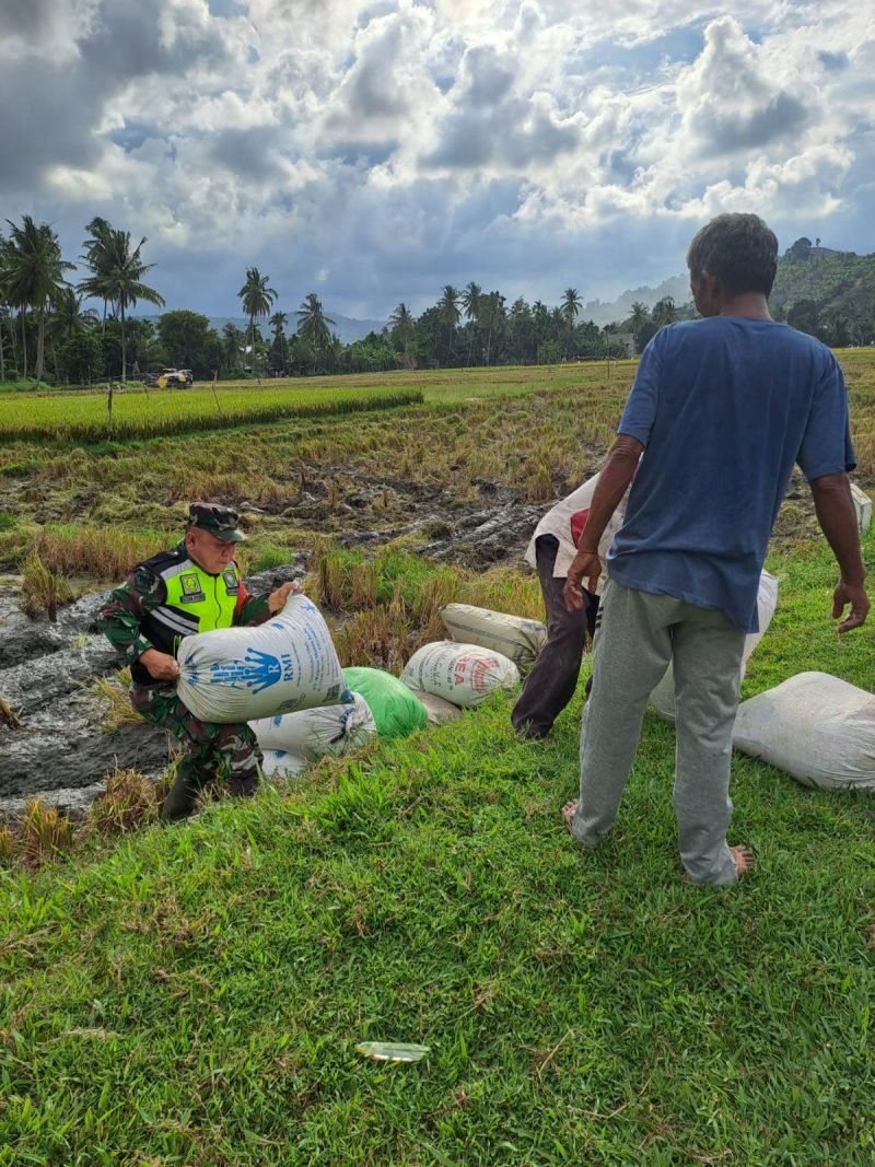 Bireuen, – Serda Wusto Triputro Babinsa Koramil 06/Peusangan Kodim 0111/Bireuen membantu petani mengangkut hasil panen padi yang baru selesai dipanen menggunakan mesin pemotong di Desa Binaan bertempat di Desa Cot Bada Baro Kecamatan Peusangan Kabupaten Bireuen. Minggu (17/11/24).