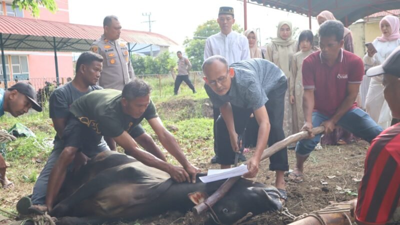 Banda Aceh – Polresta Banda Aceh menyembelih enam ekor sapi dan dua ekor kambing kurban dalam momen Hari Raya Idul Adha 1446 Hijriah yang dilaksanakan di halaman belakang Polsek Kutaraja, Banda Aceh, Sabtu (7/6/2025) pagi.
