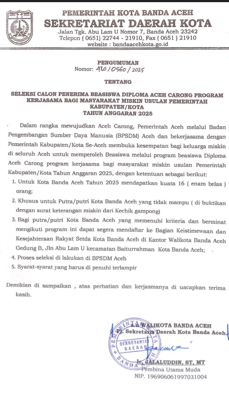 Banda Aceh –Pemerintah Kota Banda Aceh mulai membuka pendaftaran seleksi untuk calon penerima beasiswa diploma Aceh Carong program kerjasama bagi masyarakat miskin usulan kabupaten/kota tahun 2025.