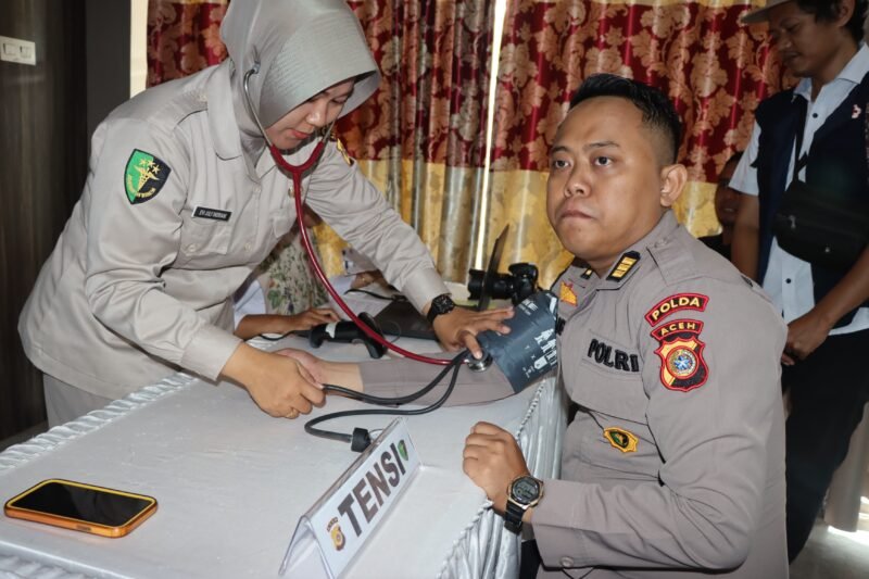 Banda Aceh — Polda Aceh menggelar kegiatan Bakti Kesehatan (Bakkes) dalam rangka memperingati Hari Bhayangkara ke-79 yang dipusatkan di Aula Presisi Polda Aceh, Senin, 16 Juni 2025. Kegiatan yang dilaksanakan secara serentak di seluruh Indonesia ini turut dihadiri oleh Kapolda Aceh, Irjen Pol Dr. Achmad Kartiko, dan terhubung secara virtual dengan pelaksanaan bakkes yang dipimpin langsung oleh Kapolri, Jenderal Pol Drs. Listyo Sigit Prabowo, dari Polres Metro Bekasi.