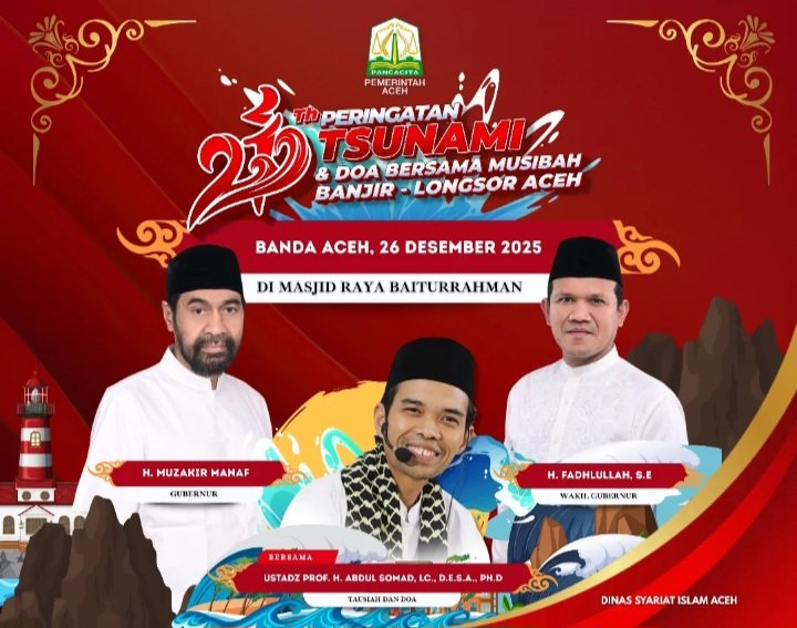 Acara akan dilaksanakan pada Jumat, 26 Desember 2025, pukul 08.00 – 11.00 WIB di Masjid Raya Baiturrahman Banda Aceh.